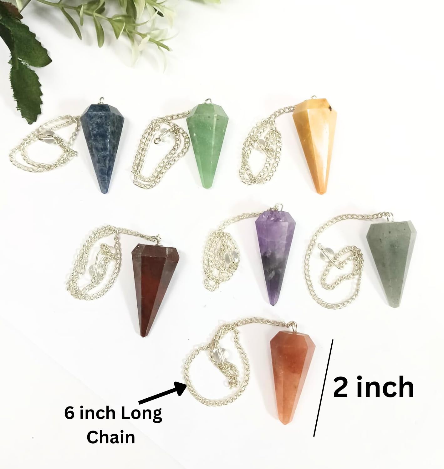Jet Amazing 7 Chakra Cone Shaped Pendulum Set. 7 Chakra Stones are Amethyst, Blue Aventurine, Lapis, Green Aventurine or Green Mica, Yellow Aventurine, Red Aventurine & Red Jasper. Approx. size 17 mm * 22 mm; Kindly note that since all our products are handcrafted and carved there always exist slight deviation in size, shape, color, looks compared to the image shown here. However the Healing Qualities and Metaphysical Properties are EXCELLENT.