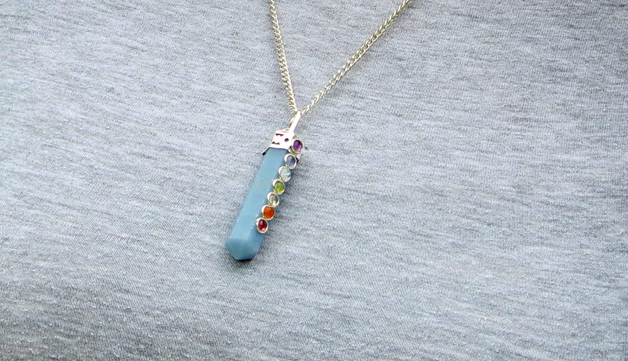 IMAGE IS JUST A REFERENCE The Chakras are the seven power points in the human body that circulate energy or the life force also known as prana. Wear this pendant to clear the energy flow of the chakras. The healing stone meanings have been gathered throughout the centuries… in many cases since ancient times. The small 7 chakra cabochons are of the order: amethyst, iolite, rainbow moonstone, peridot, citrine, carnelian, garnet.