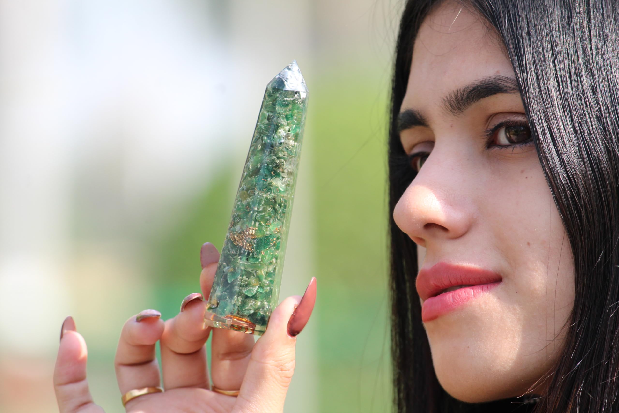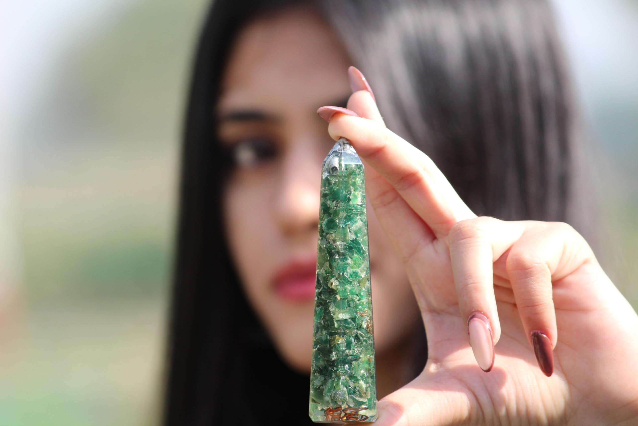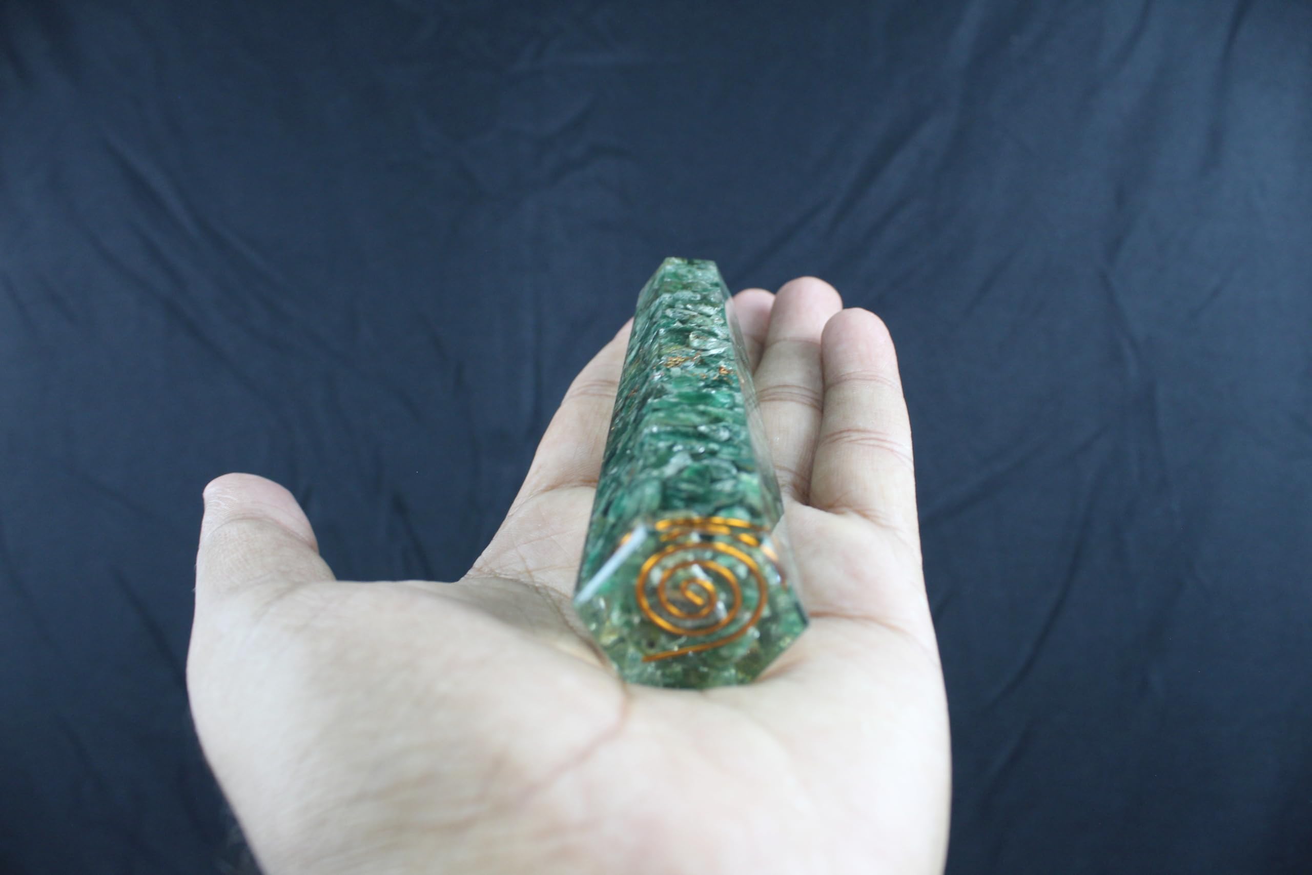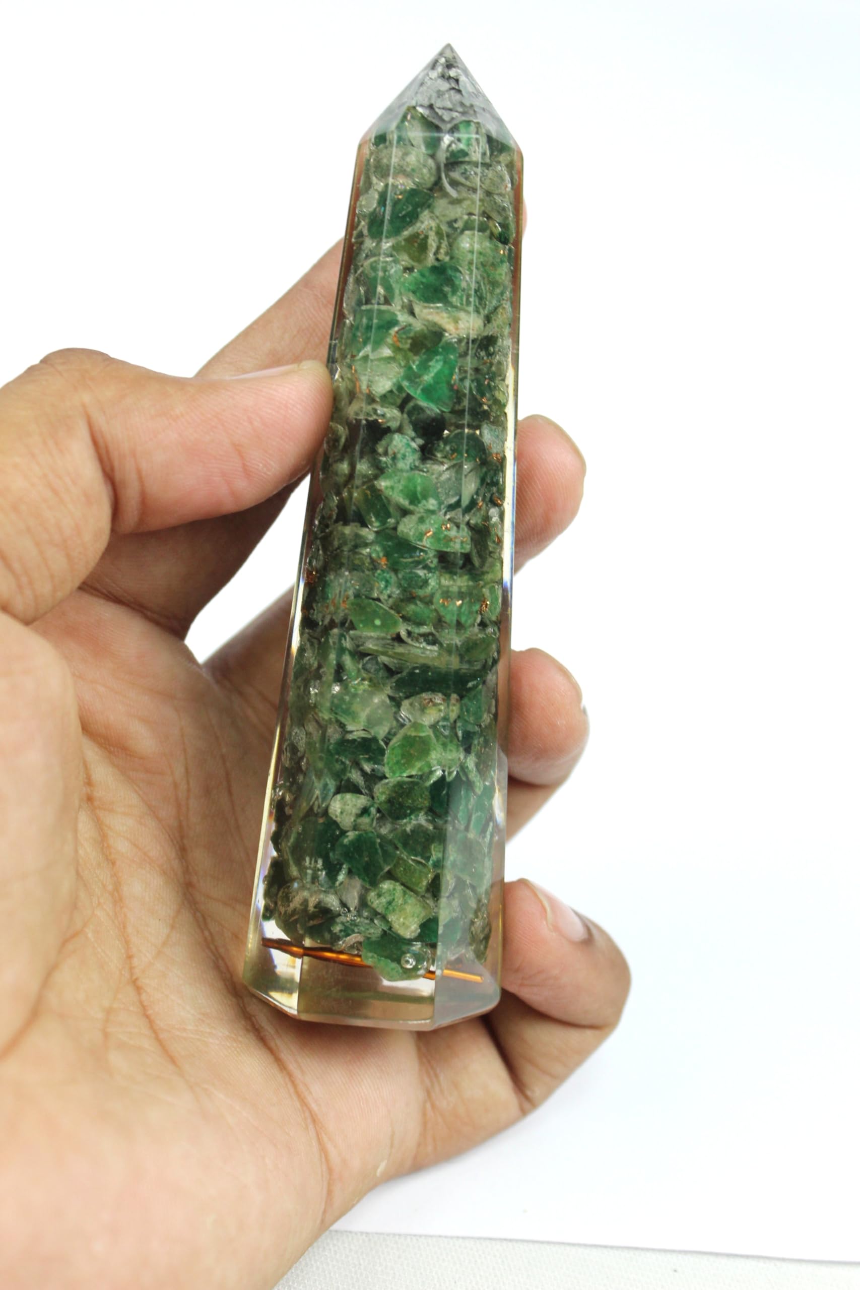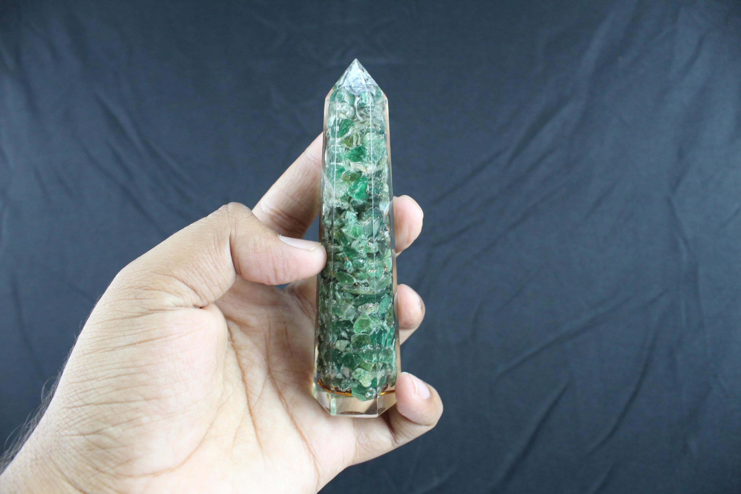 Green Mica Orgone Obelisk Jumbo Faceted Pointed Gemstone Massage Wand. Kindly note that since all our products are handcrafted and carved there always exist slight deviation in size, shape and color compared to image shown here. However, the Healing Qualities & Metaphysical Properties are EXCELLENT.
