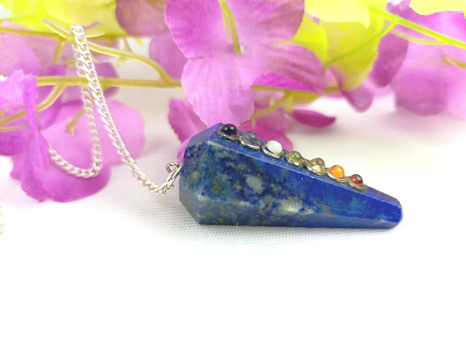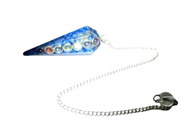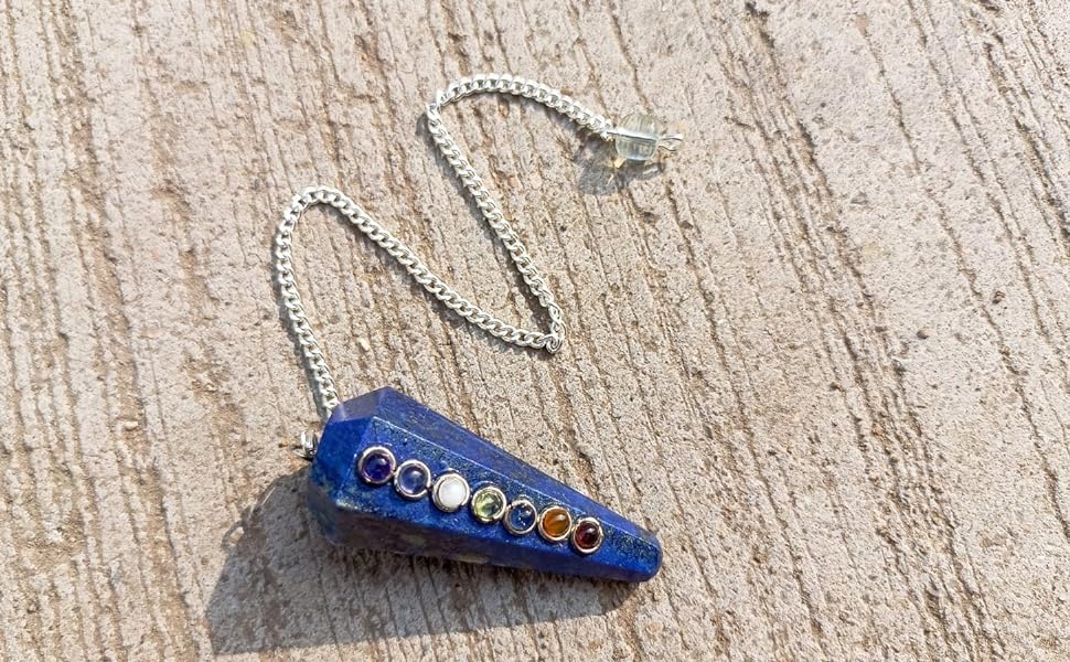 This combination of Chakra and Pendulum gives you deep sense of Positive Energy, Peace of Mind, Balance, Healing, Meditation, Protection from Evil Eye or Black Magic, Removes Negavite Energy, Success in Business or Studies, Unites Family and Friends. The small 7 chakra cabochons are of the order: amethyst, iolite, rainbow moonstone, peridot, citrine, carnelian, garnet.