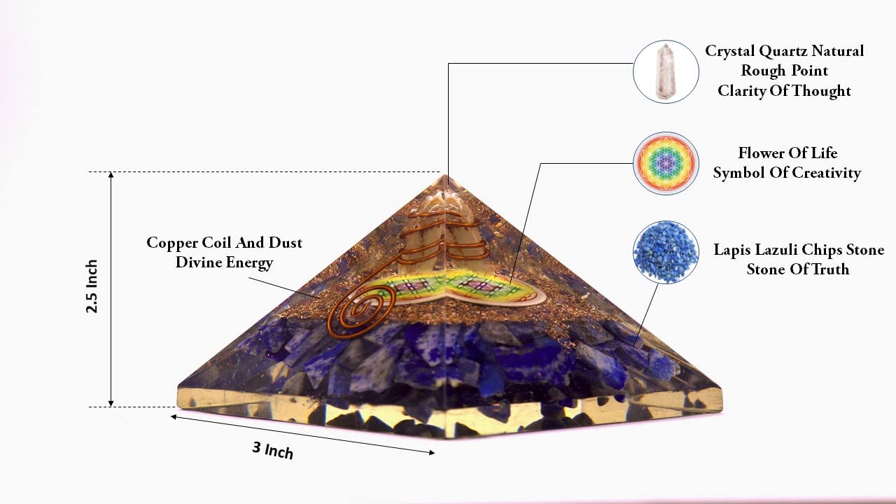 Jet Lapis lazuli Flower Of Life Orgone Pyramid Lucky Ions Generator 2.5 inch Copper Coil. This is a wonderful piece of art giving lots of Strength, Power, Mental Peace to whosoever wears it. Kindly note that since all our products are handcrafted and carved there exists slight deviation in size, shape, color, looks compared to the image shown here; however the Healing Qualities & Metaphysical Properties are EXCELLENT. Image is just a reference. Best for Peace, Power, Prosperity.