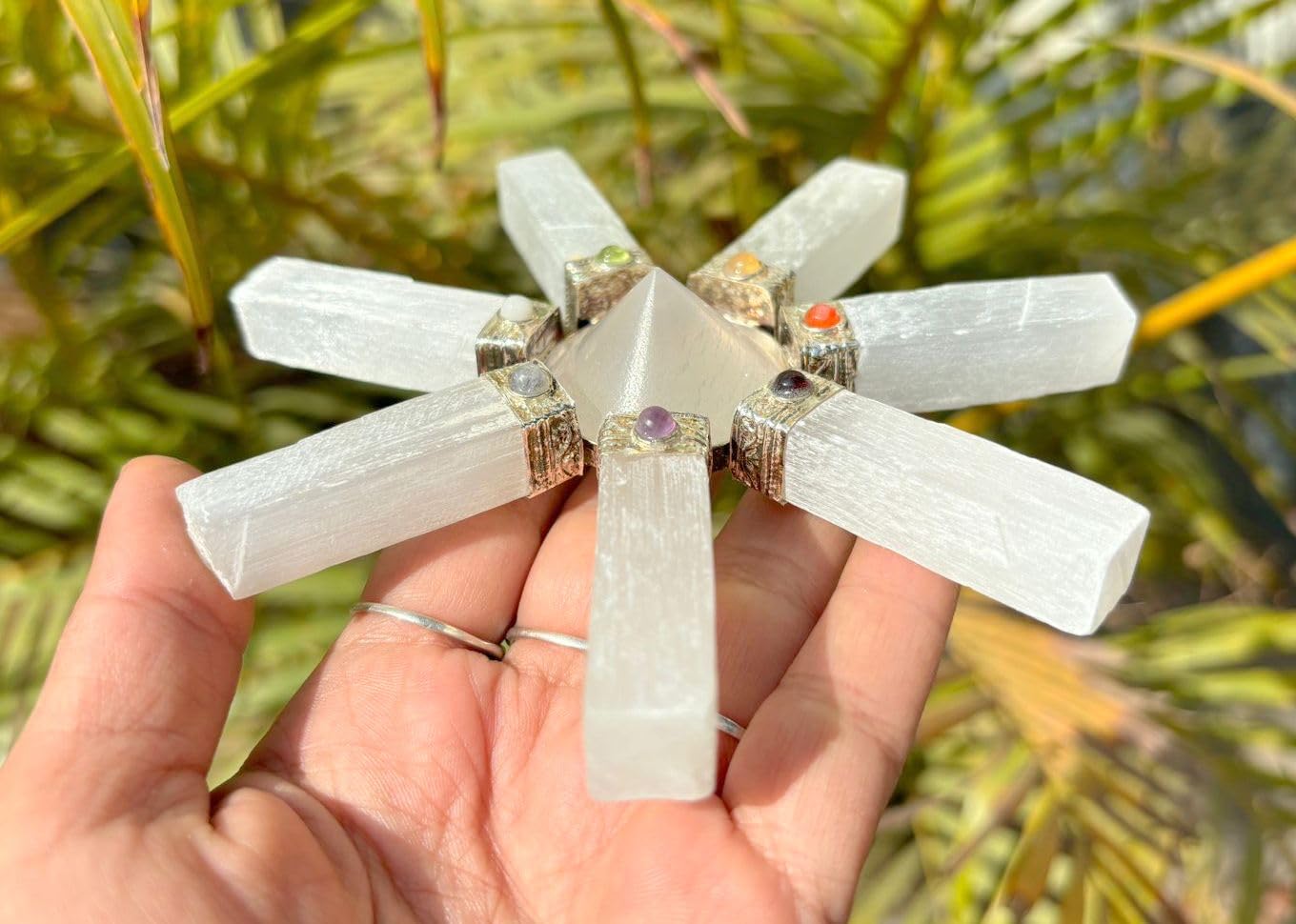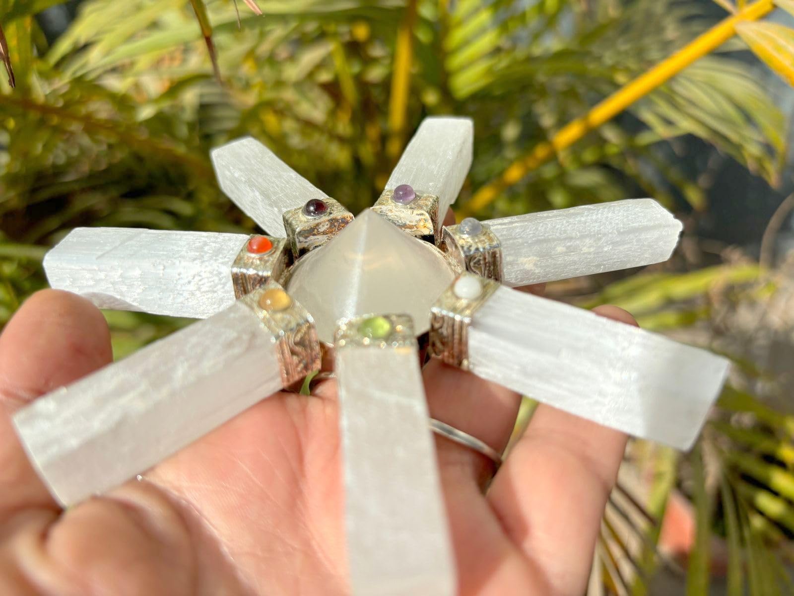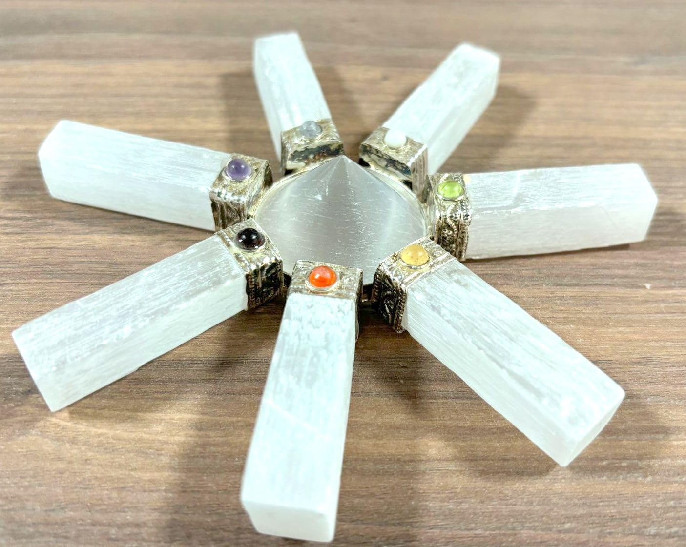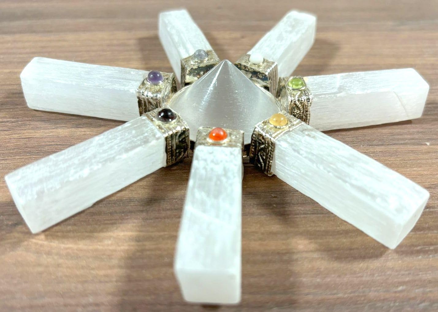 Natural 7 Point Selenite Energy Generator Point Crystal Pyramid Generator Approx. 5 inch across Height 1.25 inch long approx. Point Pyramid Stone Product Chakra Pyramid Generator Kindly note that since all our products are hand crafted there exists deviation in size, shape, color and looks compared to the image shown here. However, the Healing Qualities & Metaphysical Properties are EXCELLENT.