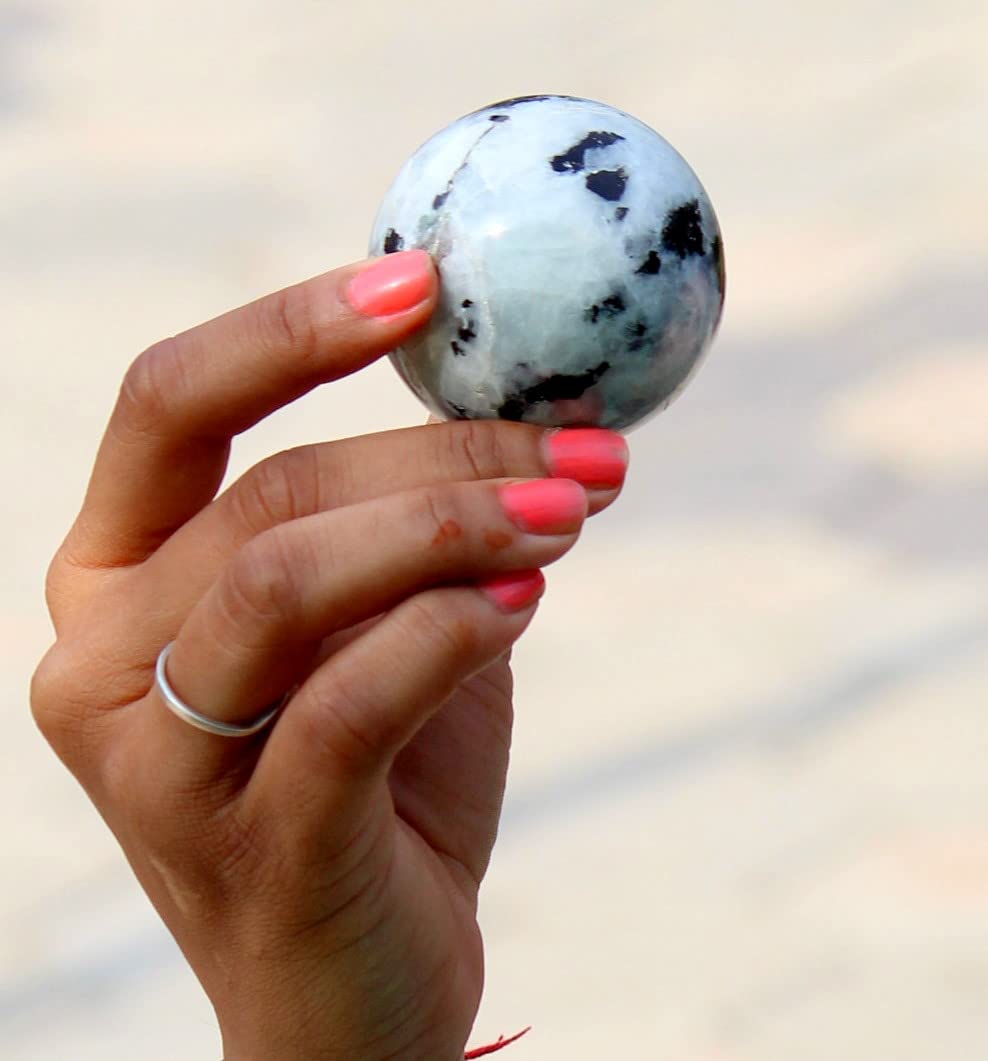 Natural Rainbow Moonstone Sphere (50-55 mm): Genuine and polished crystal ball with natural flash, ideal for energy healing, meditation, and spiritual practices.
