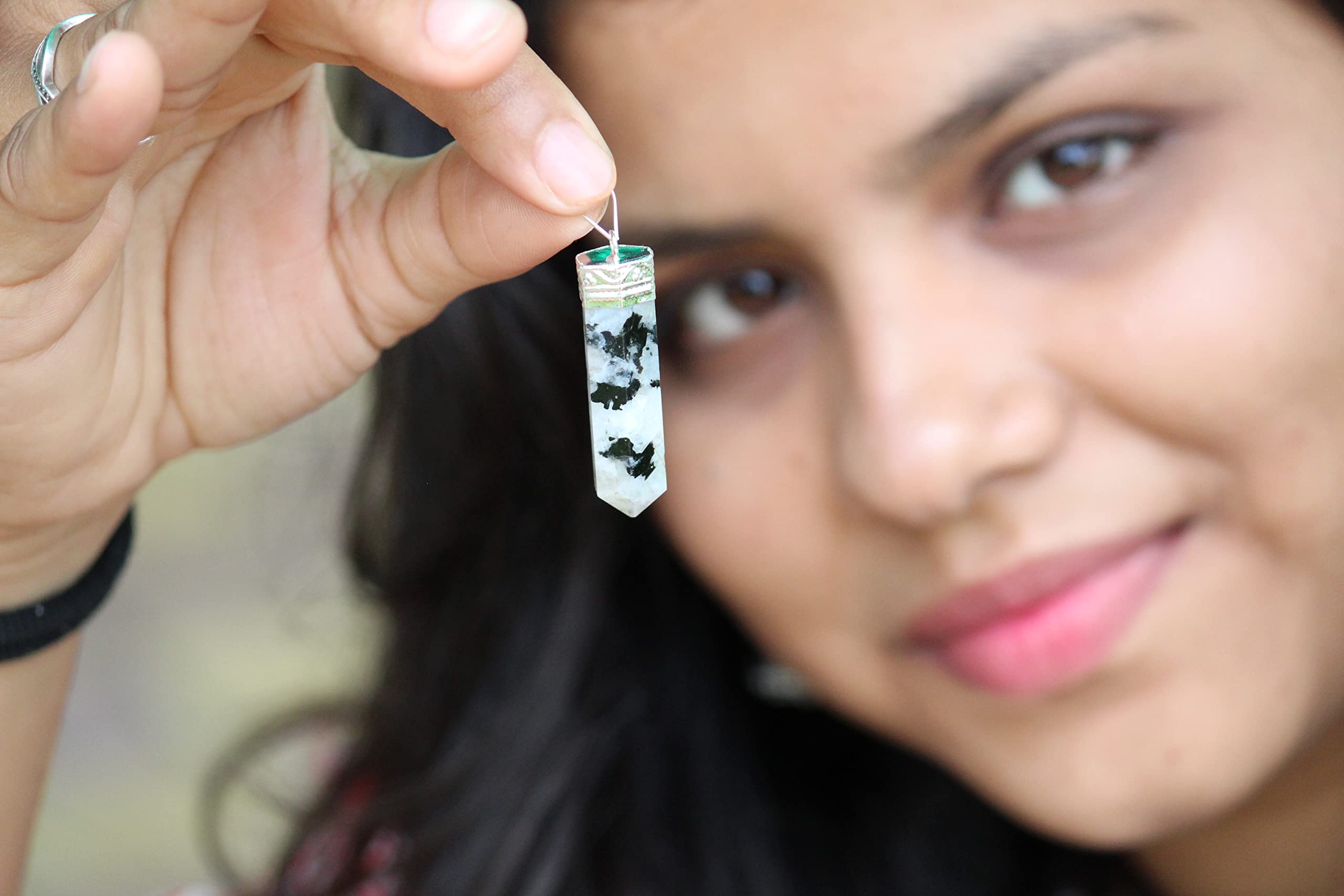 1.5″ – 1.75″ approx. Jet Rainbow Moonstone Point Pendant. A++ Grade Best Proved Results Fully Energized by us. Kindly note that since all our products are handcrafted, there will exist slight deviation in size, shape, color and looks compared to image shown here; however the Healing Qualities and Metaphysical Properties are EXCELLENT.
