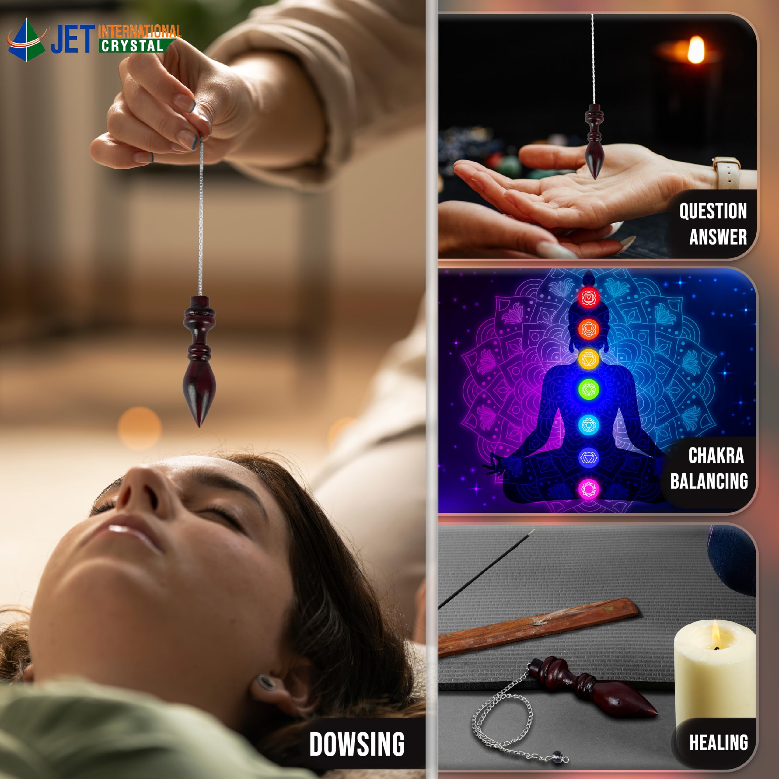 • For energy healing practices, a pendulum with Chakra stones would be an excellent choice. You might also want to choose one made with copper, a metal known to conduct, balance and amplify healing energies