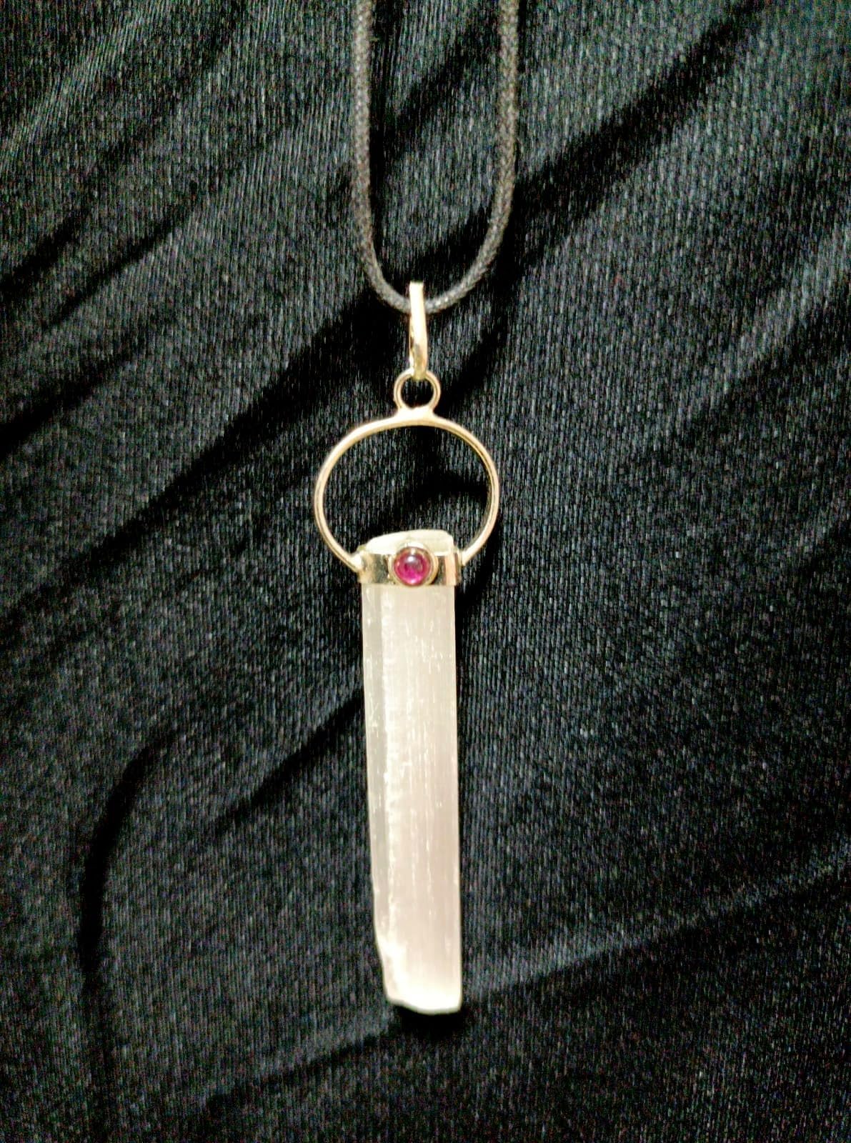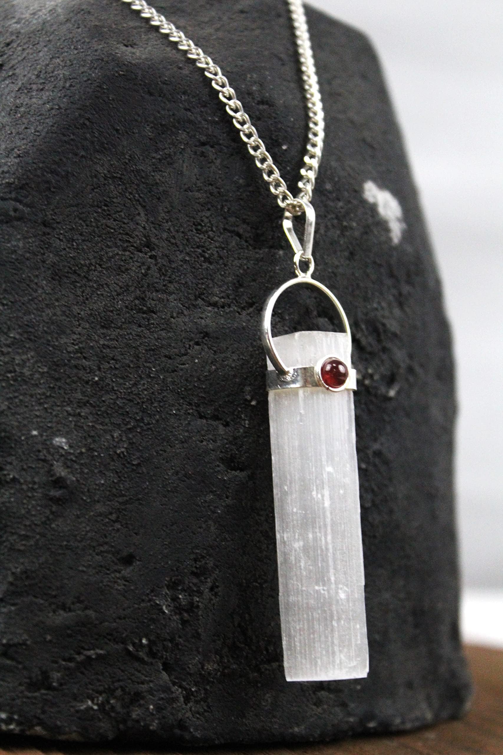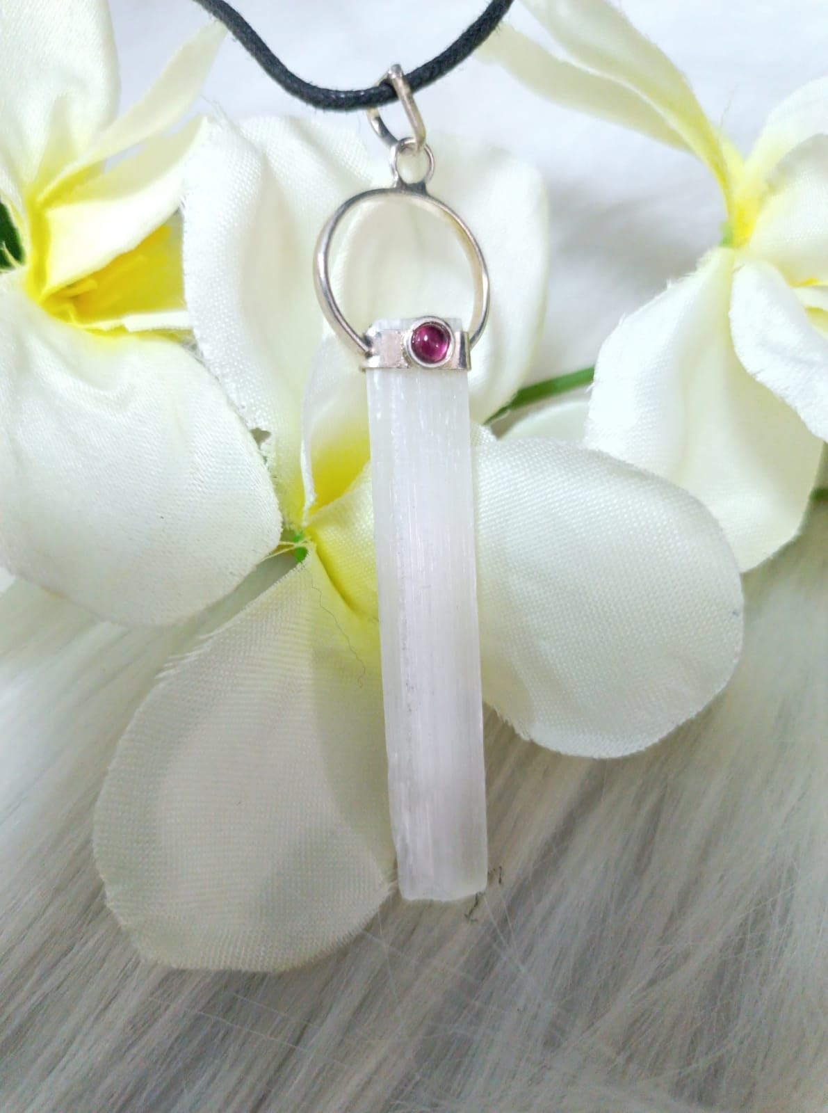 Jet International Product. Rough Selenite Silver Plated Pendant 2 inch long approx. Garnet Cabochon Genuine Authentic Original; Pouch Available. Best Seller Worldwide. Kindly note that since all our products are handcrafted, there always exists slight deviations in size, shape, color of the products compared to image shown here. However, the Healing Qualities & Metaphysical Properties are EXCELLENT.
