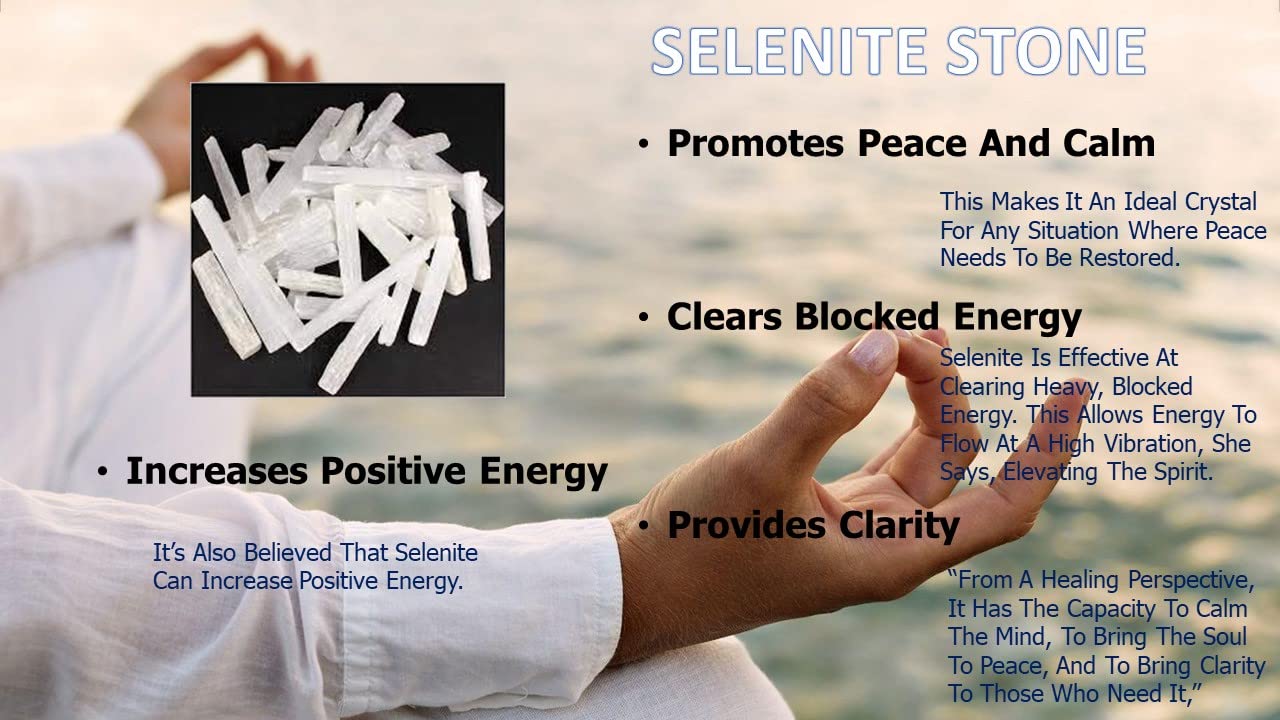 Selenite crystals are remarkably peaceful. They carry a very high vibration, and instill clarity of mind and a deep sense of inner peace.