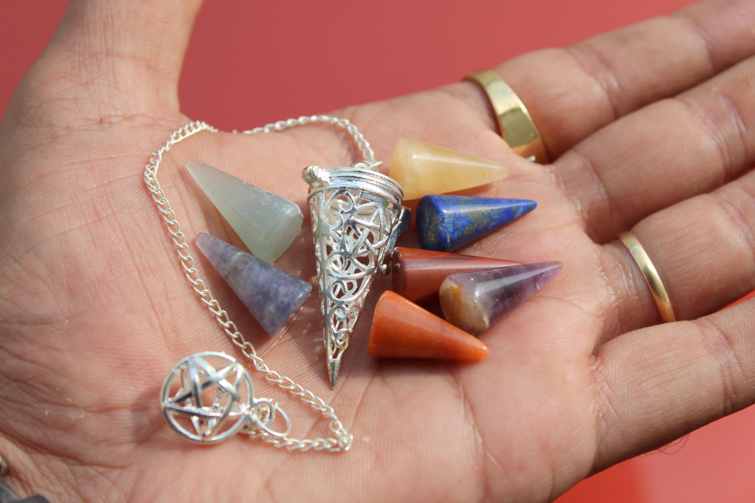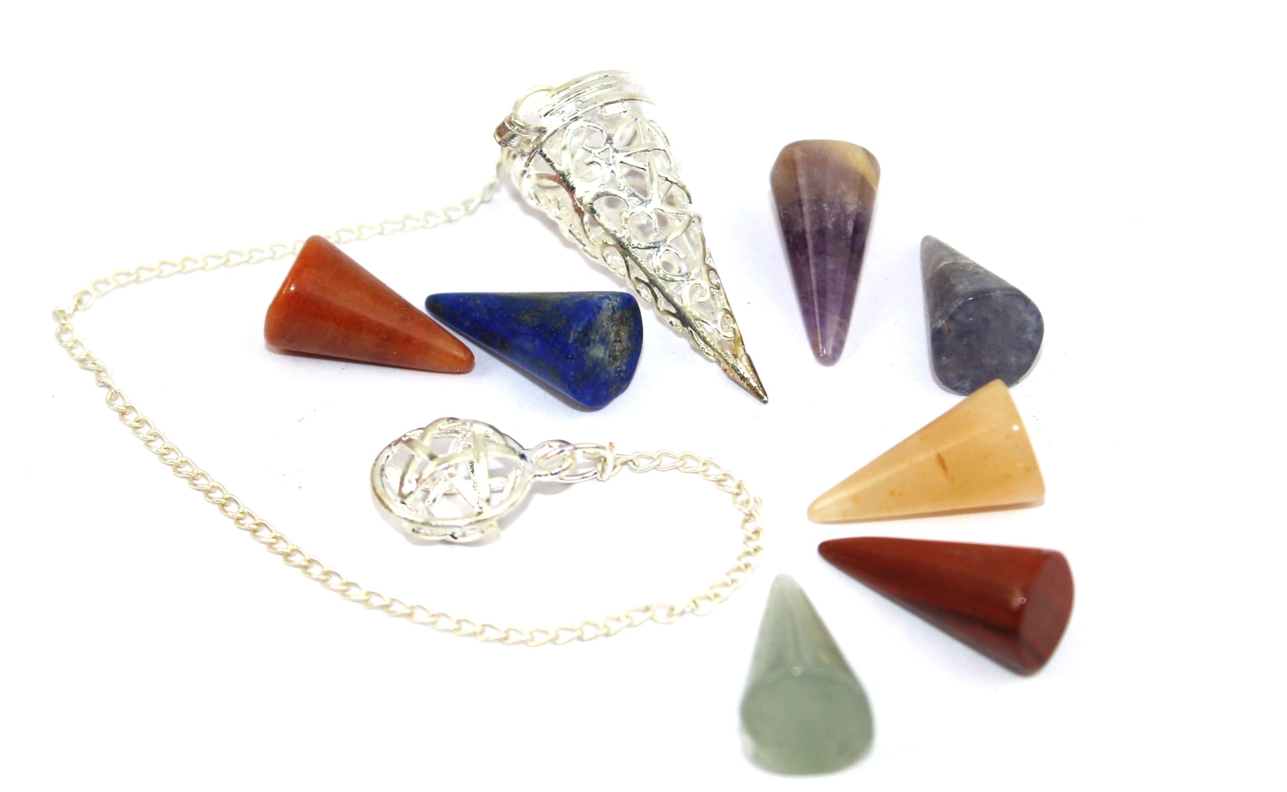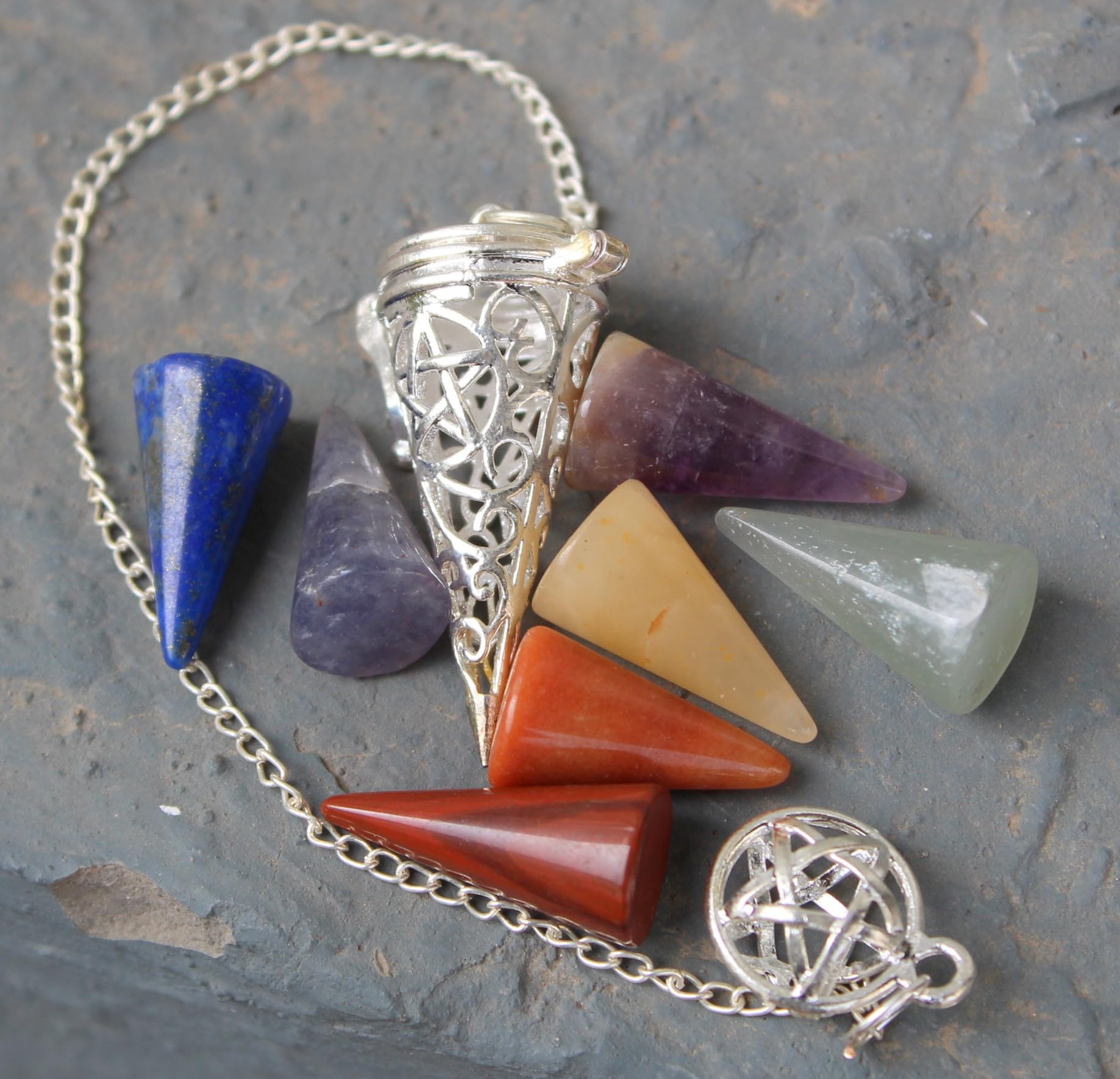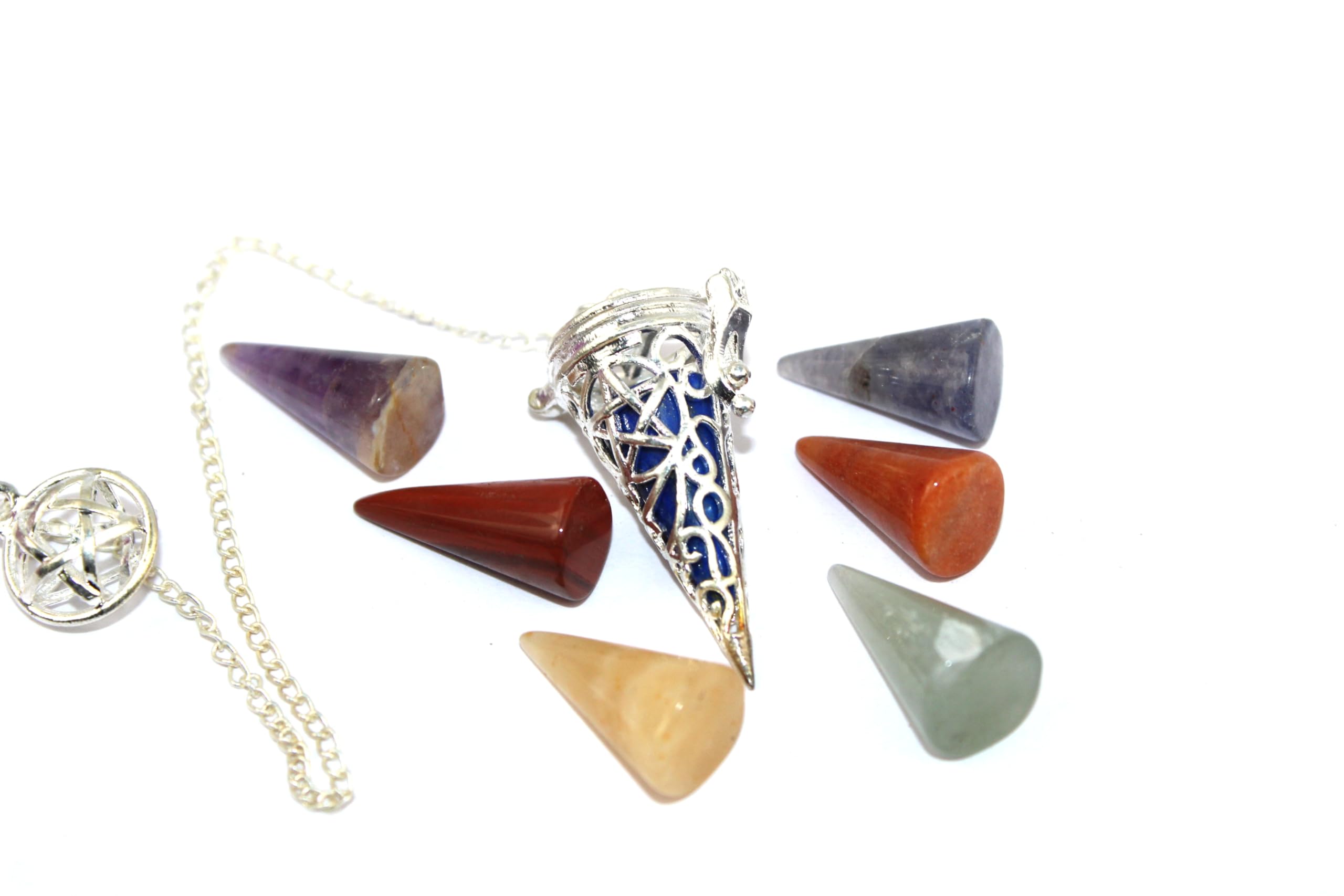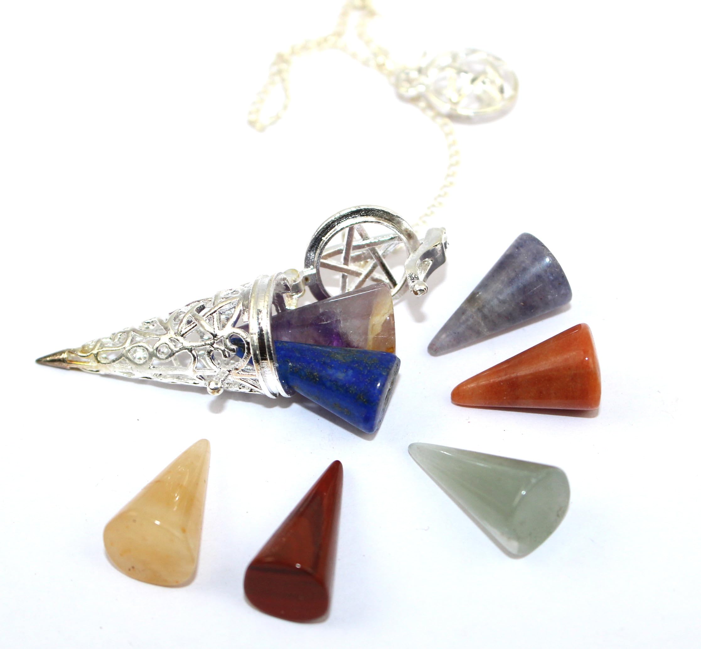 This elegant pendulum uses the symbol of a Pentagram, Om or Triquetra to create a silver tone cage used to hold one of the seven colorful stones provided to help bring the specific purpose of that color into your divination. Place the colored stone within the pentagram cage pendulum and use it to help find the answers that you seek.