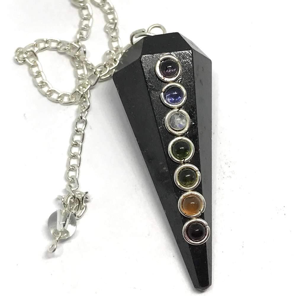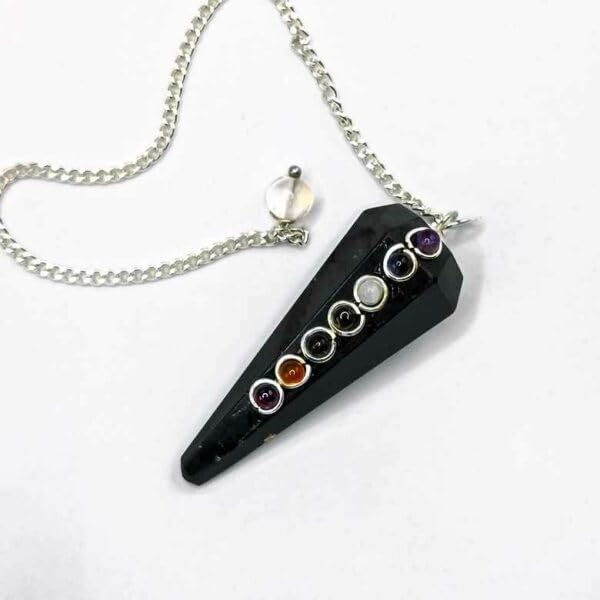 This combination of Chakra and Pendulum gives you deep sense of Positive Energy, Peace of Mind, Balance, Healing, Meditation, Protection from Evil Eye or Black Magic, Removes Negative Energy, Success in Business or Studies, Unites Family and Friends. The small 7 chakra cabochons are of the order: amethyst, iolite, rainbow moonstone, peridot, citrine, carnelian, garnet.