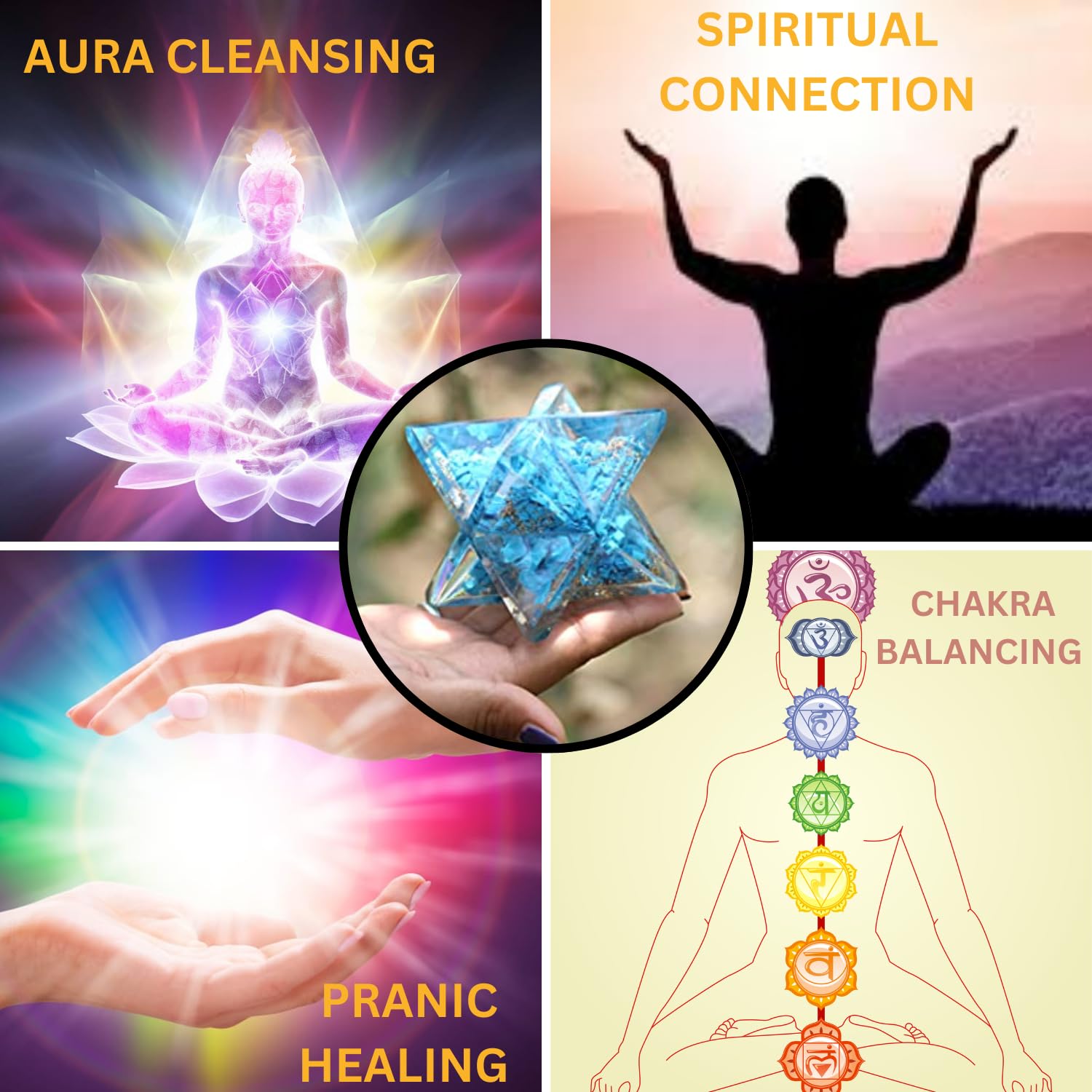 MERKABA MEANIGN :- The word Merkaba can be translated as light -Mer, Spirit-Ka body-Ba, it means spirit and body surrounded by Light. A Merkaba shaped crystal appears as a star tetrahedron; a 3-dimensional 8-pointed star made from two triangular pyramids, one pointing up, the other down. It helps you to be receptive to higher guidance. Amplifies, focuses, stores, transforms, energizes. Perfect for focusing affirmations and prayers.
